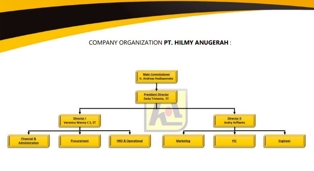 PT. HILMY ANUGERAH in running the company is led by a.President Director who is responsible for the overall management and operations of the company. The company's Board of Commissioners functions as an advisor and director in decision making in the areas of marketing, management and operations of the company's activities.